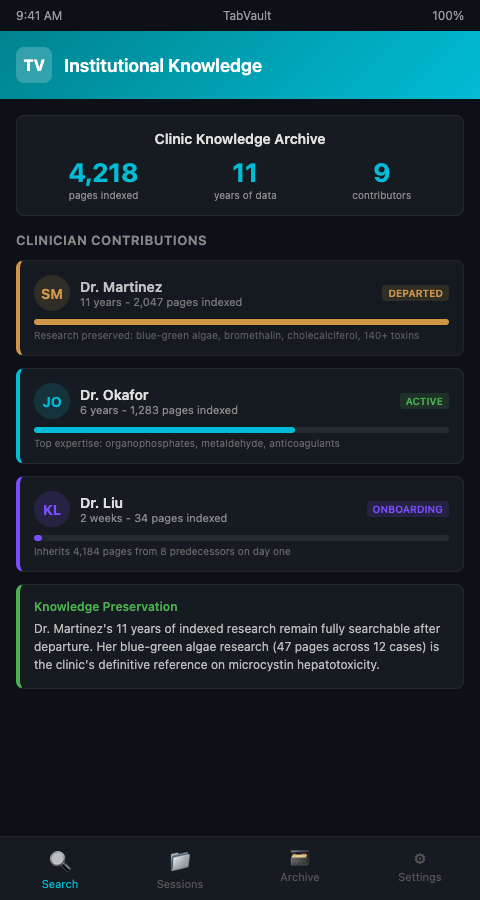 Dr. Martinez spent eleven years researching thousands of poisoning cases at your hospital. When she leaves, her indexed research stays. Every blue-green algae microcystin protocol, every rare exotic animal toxicosis reference, every VIN discussion thread she consulted at 3 AM during a complex case — all permanently searchable in the practice's shared archive. The new clinician who replaces her inherits a decade of curated toxicology references on day one, and every shift she works adds her own research to the institutional corpus. The knowledge compounds across careers instead of resetting with each departure.