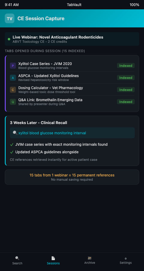That CE webinar on novel anticoagulant rodenticides just generated fifteen supplementary reference tabs. With TabVault active during the session, every one of those references — the presenter's cited PubMed case series, the updated ASPCA dosing guideline, the pharmacology calculator linked in the chat — is already indexed before the webinar ends. Three weeks later, when a patient presents with the exact toxin the lecture discussed, you type the compound name into your archive and retrieve the CE materials alongside your clinical case references, merging your continuing education investment with your hands-on clinical research in a single search.