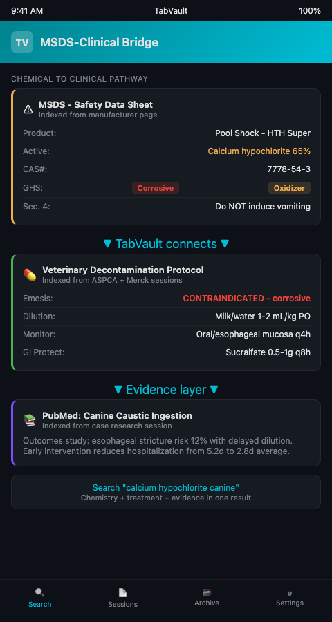 Picture the next industrial chemical exposure that walks into your ER. The owner hands you a product label with a brand name you have never seen. With TabVault, you pull up the Safety Data Sheet, identify the active ingredient by CAS number, then search your archive for that compound. Every clinical decontamination page, every ATSDR toxicological profile, every PubMed outcome study you or any colleague previously indexed for that chemical appears together — bridging the gap between the MSDS chemistry and the veterinary treatment protocol in a single query rather than a multi-tab scramble under time pressure.