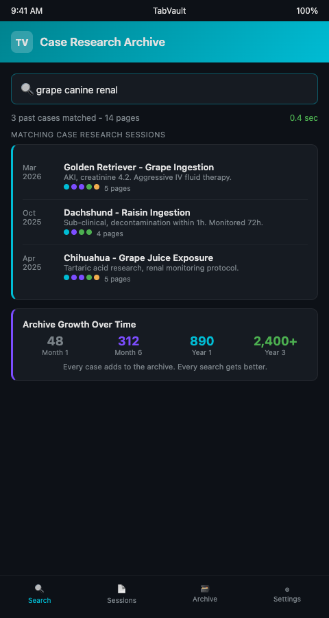 TabVault makes this past poisoning case retrieval practical. During the grape toxicosis case last spring, you opened a PubMed case series, an ASPCA dosing threshold page, a Merck Manual entry on acute kidney injury, and a VIN discussion thread about fluid therapy rates. TabVault indexed all of them. Today, when the identical case arrives, you type "grape canine renal" and every one of those pages appears. The PubMed case series you could not find is right there, alongside the dosing threshold and the fluid therapy discussion. Your research from six months ago is instantly accessible.