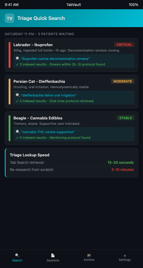 Three poisoning cases arrive within an hour on a Saturday night. TabVault lets you triage the research as fast as you triage the patients. Type "ibuprofen canine emesis window" for the Labrador and retrieve the decontamination timing threshold in seconds. Switch to "Dieffenbachia feline oral irrigation" for the cat and pull up the calcium oxalate crystal management protocol you indexed last month. Check "marijuana edible canine supportive care" for the Beagle and find the VIN thread on THC monitoring parameters a colleague researched during a similar case. Each lookup draws from your practice's accumulated research history, converting what would be three separate web searches into three instant archive retrievals.