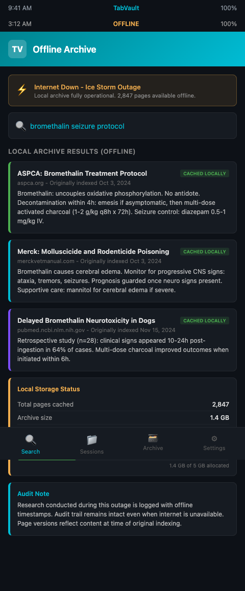 The ice storm knocks out your internet at 1 AM, and a dog is seizing from suspected bromethalin ingestion. With TabVault, your treatment protocol is already on the workstation — indexed locally during a previous case, stored on your own hardware, searchable without any network connection. The ASPCA bromethalin treatment page, the Merck seizure management entry, the PubMed article on multi-dose charcoal timing — all available offline because they were captured at the moment of first viewing. Rural mobile practices, disaster response teams, and any clinic in an area prone to connectivity disruptions gain the same benefit: a toxicology reference library that travels with the clinician and never depends on a router.