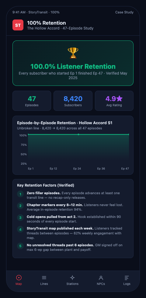 The takeaway from this podcast success story is not that near-100% retention requires extraordinary content. The show's sessions were good but not exceptional by the standards of major actual plays. What was exceptional was the structural discipline: every thread tracked, every dormant stop labeled, every cold open functioning as a route map for listeners at any stage in the feed.