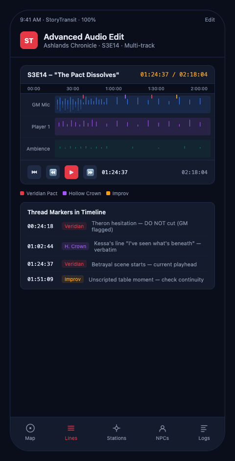 Pre-edit narrative review. Before opening the DAW, map the episode's active transit lines against the raw session recording. Identify the three to five scenes that are structurally load-bearing — the ones where a thread advances to its next station. Those scenes get the most careful editorial attention: tightest cuts, cleanest levels, any ambient design that reinforces the moment's narrative weight.