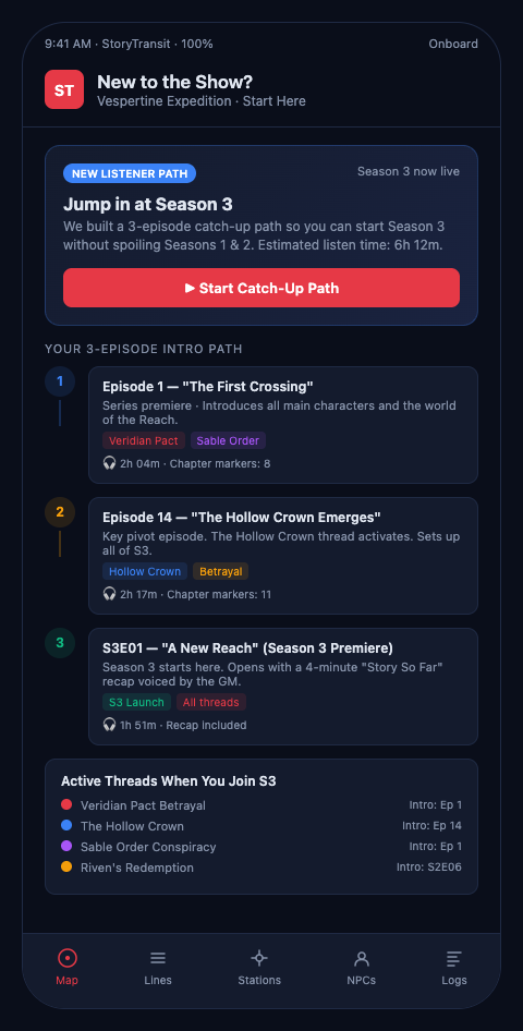 The transit map show notes block. Every season three episode's show notes should include a one-paragraph "story so far" that describes the currently active transit lines in plain language. This doesn't require a full recap — three sentences on the main arc, one sentence on each secondary arc that's in motion. New listeners scan it before listening; returning listeners skip it. The cost is minimal; the onboarding value for the late-entry audience is significant.