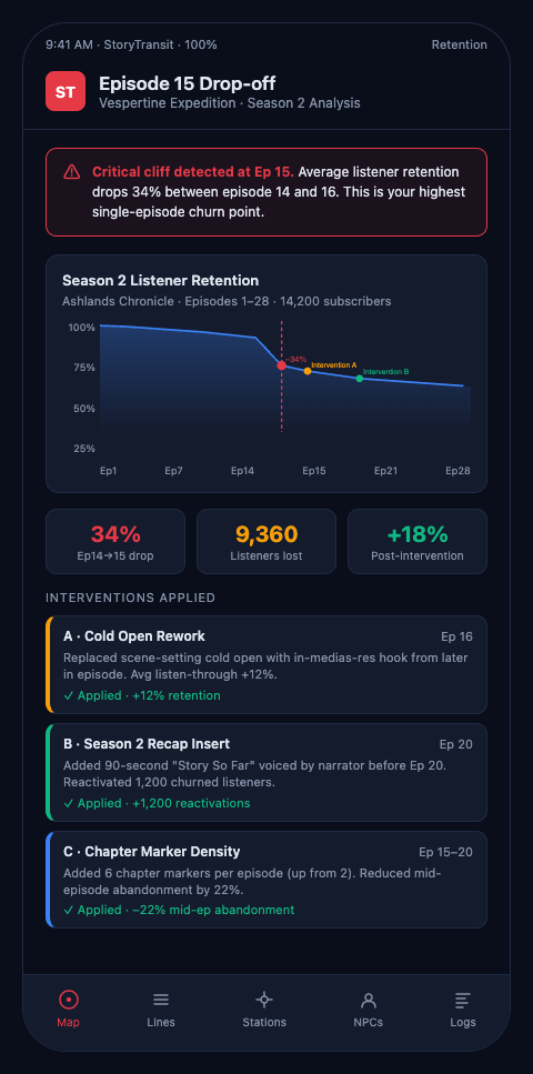StoryTransit treats the episode 15 drop-off as a transit problem. When too many lines are running, new and returning riders need a system map — something that tells them which lines are currently active, which stops matter right now, and how to get back on track if they've missed a few stations.