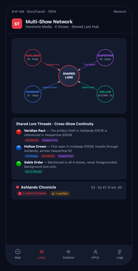 StoryTransit's multi-show network tools — the central lore map, the cross-show junction tracker, the lore reconciliation log — are built for production teams managing this complexity at scale. The system keeps shared lore as a live operational document rather than a founding artifact that drifts out of date.