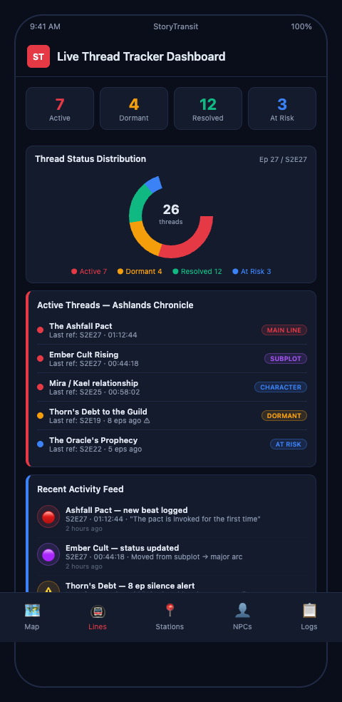 The transit metaphor makes thread tracking legible. Each live thread is a transit line. Every episode where that thread moves—where something happens on that line—is a station. The episode where the thread was first introduced is the origin station. The episode where it resolves is the terminus. Everything in between is the route.