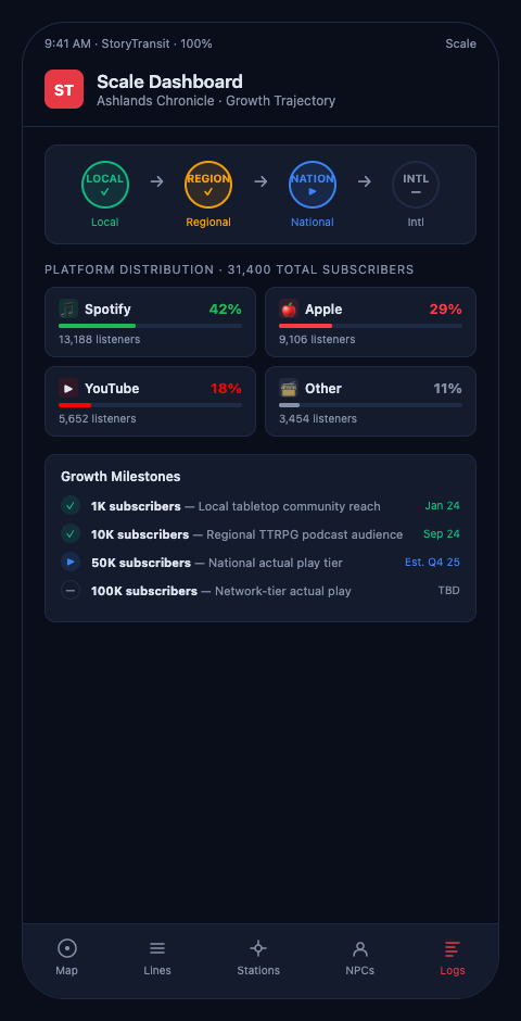 Local-to-national scaling requires building the narrative infrastructure before you need it — not after your first continuity error shows up in listener reviews. StoryTransit gives producers the transit map that makes that infrastructure concrete, sharable, and production-ready.