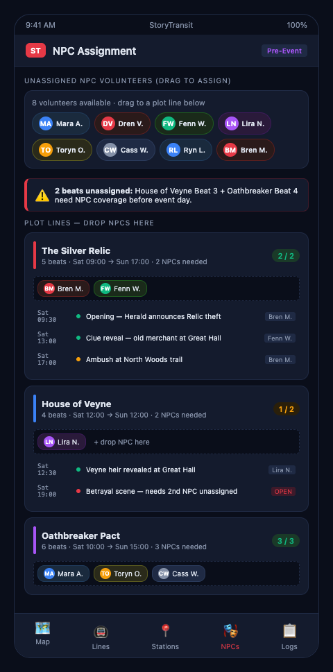 StoryTransit is designed for LARP event organizers who need pre-event NPC assignment tools that surface collisions before event day. If your last weekend event had uncovered stations because two NPCs showed up for the same scene and nobody covered the other one, the waitlist is open—join to get early access to the NPC assignment and plot staffing features.