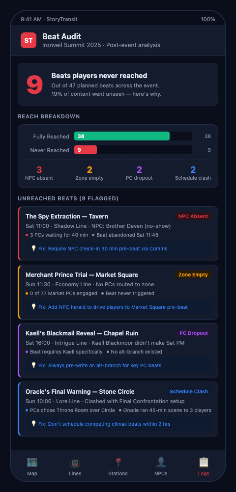Game Wrap research from Analog Game Studies confirms that discovering which plot threads were never encountered is the primary function of post-event review. But most organizers rely on player reports during Game Wrap to identify those gaps—which means they only hear about beats that players knew existed and cared about. Silent gaps—story beats players never knew to look for—go undiscovered entirely. The faction storyline that was supposed to escalate on Sunday afternoon. The NPC who was scheduled to deliver a key revelation in Zone 5. Players never encountered either, but they don't know what they missed, so they don't report it.