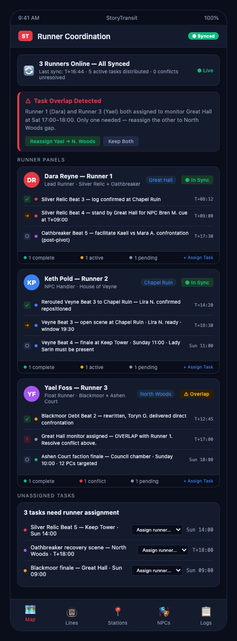 Build a runner-to-line assignment table in StoryTransit. Every station record shows which runner owns it. When a runner radios in a pivot update, every other runner can see immediately which stations in the system that pivot affects and who the line owner is for each. Runner team management at scale becomes operational rather than relational — you are coordinating through a shared map, not through individual memory and trust. Modeling the Story Facilitation of Game Masters in Multi-Player Role-Playing Games