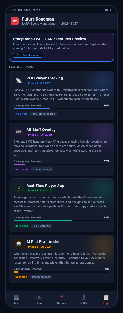 The future of LARP event management software will look less like a database and more like a transit operations center. The core metaphor—plot threads as transit lines, story beats as stations, character arcs as routes—isn't just a visualization choice. It's an operational logic that maps naturally to how large-scale live-action events actually function.