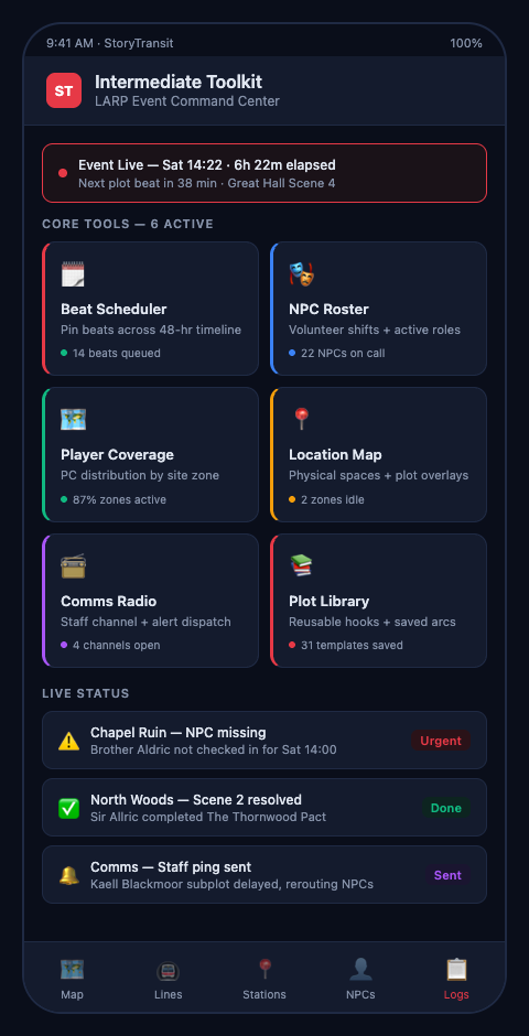 StoryTransit is built for intermediate LARP organizers who have outgrown improvised systems and want a purpose-built plot dashboard that covers runtime status, NPC dispatch, and post-event documentation. If you are running multi-plot live-action events and feel the gaps in your current toolkit, join the waitlist for LARP organizers and get early access before your next event.