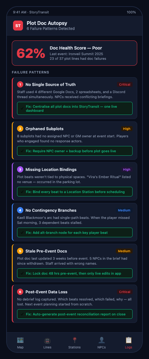 LARP plot documentation fails because it is designed for a planning phase and then expected to serve an operational phase without modification. Fixing LARP narrative records means rebuilding documentation around the operational phase — making runtime updates easy, making records accessible to the whole team in real time, and making post-event review a structural part of the event rather than an optional add-on.