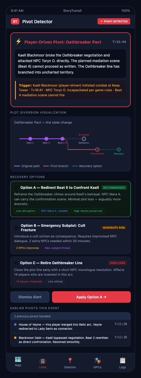 StoryTransit models plot structure as a transit network. Player-driven pivots are rerouting events — a line that was running north now needs to run east, and the passengers (both players and costumed volunteers) need to be redirected without stopping service.
