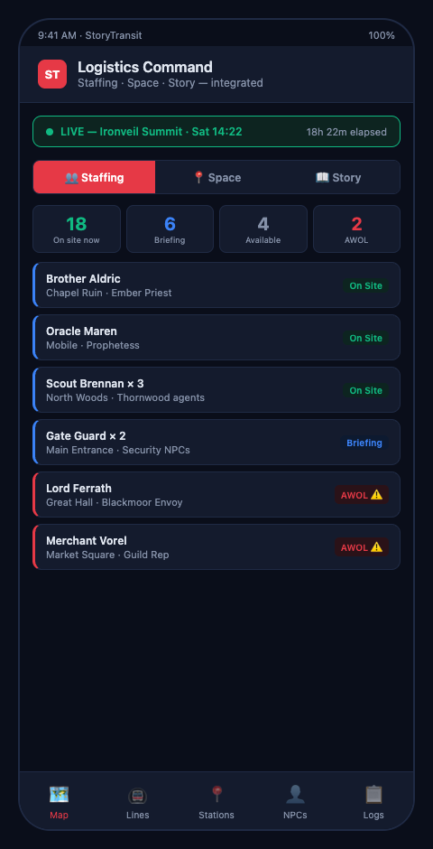 StoryTransit is built for LARP event organizers running large campaign events where all three logistical systems need to operate simultaneously and in coordination with each other. The transit dashboard gives your radio dispatcher real-time visibility across every parallel plotline, every story beat, and every dormant stop in the system. Join the Waitlist for LARP Organizers and run your next multi-plot weekend with the coordination infrastructure it actually requires.