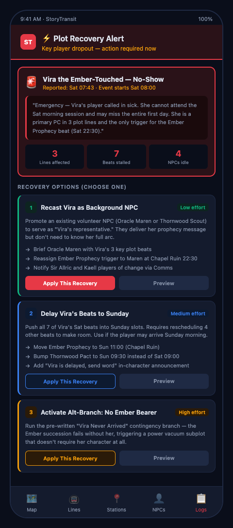 In StoryTransit's framework, a player dropout triggers an immediate dormant stop audit. Every story beat assigned to the departing character's arc is flagged on the plot dashboard. The plot runner assigned to that line receives an alert. The radio dispatcher at the GOD tent has a list of costumed volunteers available for reassignment. Within fifteen minutes of a dropout confirmation, the plot team has a complete picture of which stranded beats need coverage, which can be absorbed into adjacent lines, and which can be intentionally held for a future event.