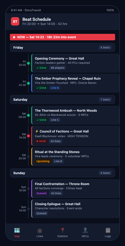 StoryTransit tracks story density as a function of active stations per time window. When your beat schedule shows a four-hour window with only passive activity, it is a signal to either schedule a dormant stop activation or reposition a mobile NPC encounter into that window to maintain density. The 48-hour event plot timeline is a living document that runners adjust as the event runs — not a fixed schedule that everyone executes regardless of what the story is doing.