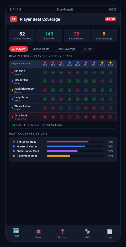 The live event logging format for player beats works as a matrix: plotlines on one axis, player groups on the other, stations as cells. When a player group completes a beat, that cell gets marked. When they skip or miss a beat, it stays blank. StoryTransit's player story beat tracking layer is built around this matrix format—LARP beat completion updates flow from runners in the field directly into the dashboard, giving dispatch a live view of player progression monitoring without requiring a dedicated logging clerk.