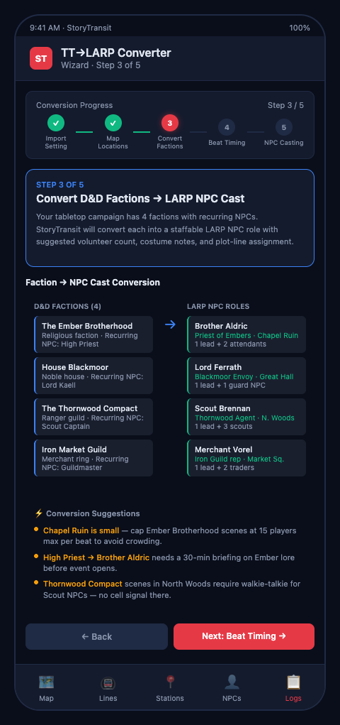 The transit metaphor is particularly useful for the format migration as a whole. Think of the tabletop campaign setting as a route map that exists only as a drawing. The LARP conversion is the project of building actual tracks, stations, and vehicles on the physical terrain of a real venue. StoryTransit supports this migration by maintaining the same plot structure across format contexts—the parallel plotlines that ran as GM-narrated arcs become transit lines with defined stations and zone assignments.