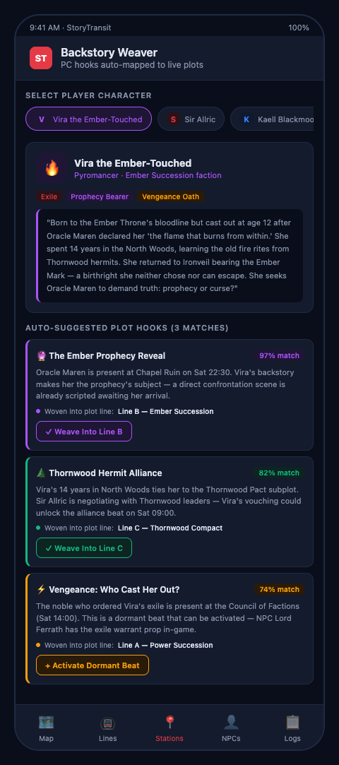 In the StoryTransit transit model, each backstory hook is a dormant stop on the character arc transit line. The plot dashboard shows its status: pending, activated, or resolved. When Saturday afternoon arrives and the dashboard shows twelve character backstories still marked pending, the radio dispatcher has actionable information: which characters need attention, which plot zones contain the relevant NPCs, and which costumed volunteers are available to deliver activation moments in the remaining session blocks.