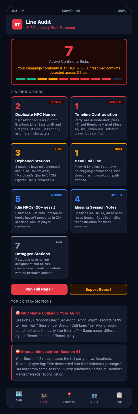 Build a transit map of current state. Identify your active lines, their most recent stations, and any dormant stops that players are likely to revisit. This doesn't need to be comprehensive — it needs to cover what's going to matter in the next ten sessions. StoryTransit is designed for exactly this triage mode: start with current state, not full history.