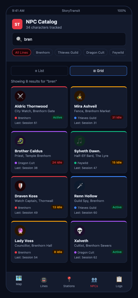 Homebrew D&D dungeon masters typically hit the NPC recall wall around Session 40-50, when the cast has grown large enough that improvisation alone can no longer maintain consistency. The time to build the catalog is before that wall, not after. StoryTransit's NPC catalog integrates directly with the campaign transit map, letting you link characters to plot stations and pull relevant records by thread rather than scrolling through an undifferentiated list.