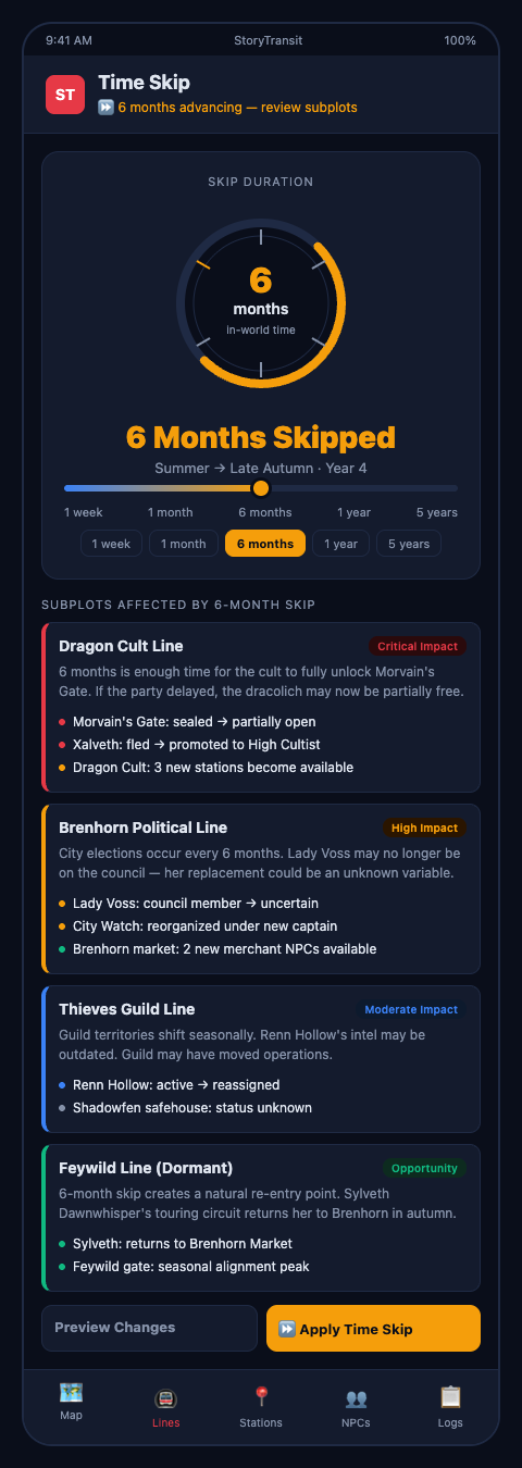 StoryTransit's gap timeline feature flags every active subplot when you enter a time skip, prompting you to record each thread's advancement before the skip session begins. The result is a world that visibly responds to the party's absence — not because the DM had extraordinary memory, but because the system captured the state that needed advancing and made the calculation structured rather than improvised.