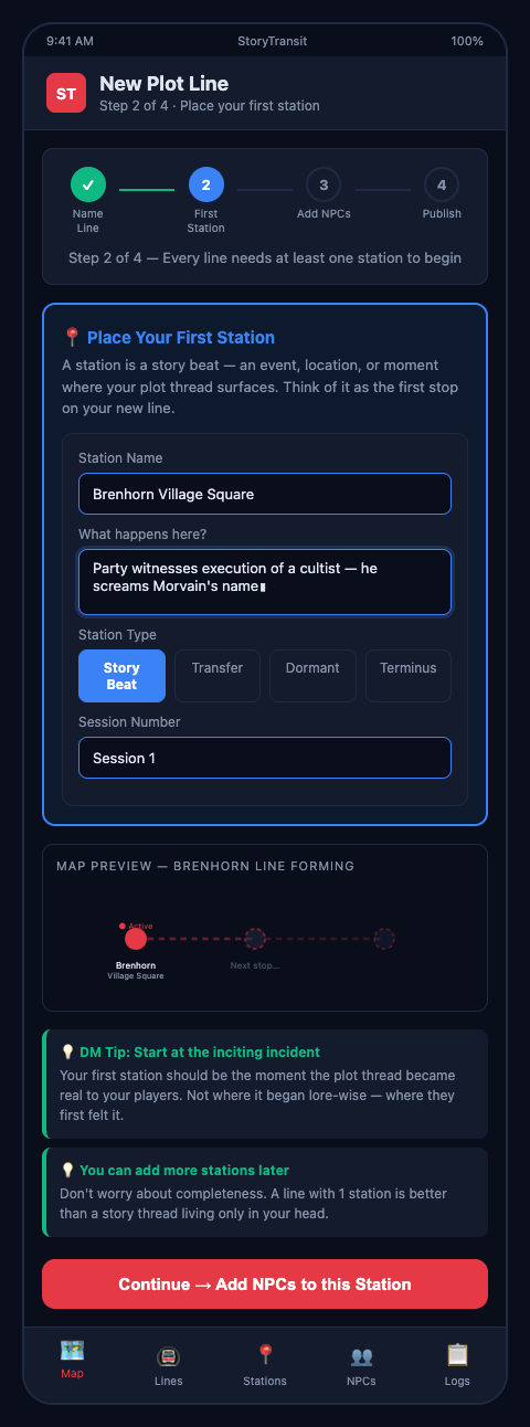 The waitlist for homebrew D&D DMs is open. If the walkthrough above described a problem you've been working around for years, StoryTransit's campaign transit map is the infrastructure you've been building by hand.