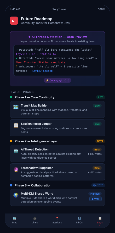 Homebrew D&D DMs running campaigns with real narrative stakes — years of sessions, dozens of NPCs, and subplots that deserve payoff — can join the waitlist now and be among the first to access the transit-map interface and automated continuity surfacing that the next generation of campaign management technology is converging on. Join the Waitlist for Homebrew D&D DMs before the tools leave you behind.