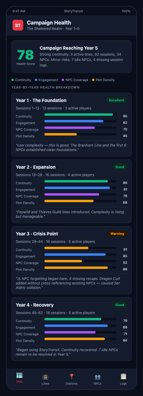 Homebrew D&D dungeon masters who want to reach Year Five don't need more creativity — they need better infrastructure. StoryTransit was designed specifically around the anatomy described above: a transit map for plot architecture, NPC continuity sheets, foreshadowing payoff receipts, and a session recap system that keeps everything current with minimal overhead.