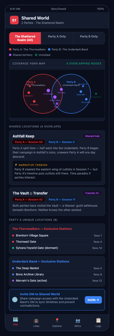 StoryTransit's world state layer tracks cross-party events and automatically updates the shared world log when either party's sessions are recorded, keeping both transit lines operating on accurate information.