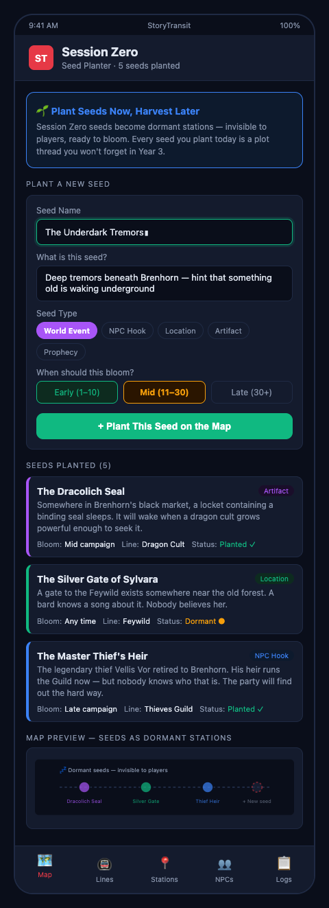 Homebrew D&D dungeon masters who invest in a rich Session Zero are investing in the future payoffs that make long-running campaigns feel intentional and alive. The difference between a campaign where players describe the worldbuilding as "incredible" and one where they describe it as "inconsistent" is usually whether the DM could find the seeds when it was time to deliver them. StoryTransit's session zero seed tracker integrates with the full campaign transit map, so every foundation you build before Session One stays visible until it's ready to pay off.