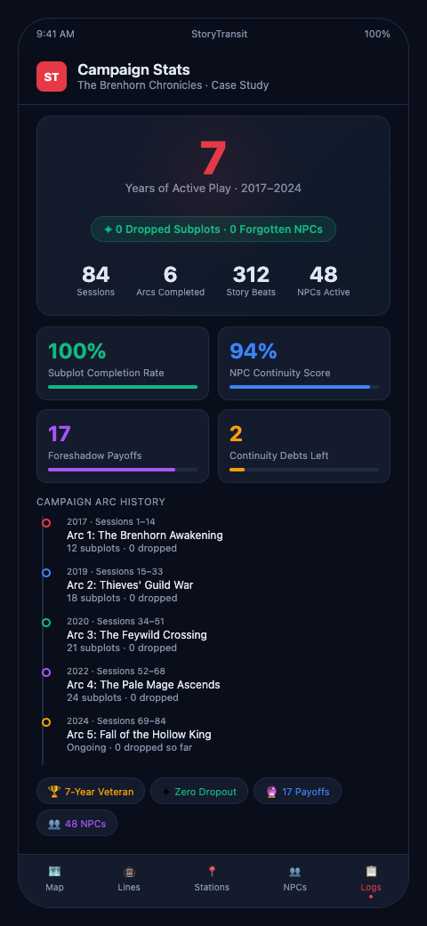 The seven-year case study DM would tell you that the hardest part of the system was not building it — it was trusting it. The first time they leaned on a dormant subplot they had not thought about in two years and found it fully intact, waiting to be reactivated with all its context preserved, was when the investment paid off viscerally. A subplot seeded in Session 11 that closed in Session 143 with all of its original promise fulfilled is what a transit map makes possible. Without the map, that subplot would have been one of the 30–40% that most long campaigns quietly abandon.