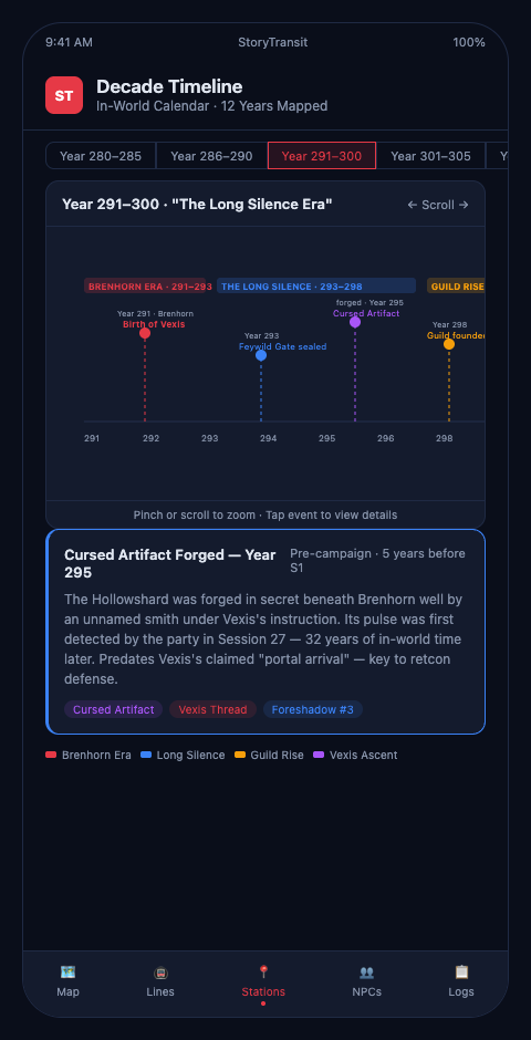 The DMs who manage decade-spanning campaigns successfully are not those with better memories. They are those who built a timeline architecture in year one that could absorb ten years of complexity without collapsing. StoryTransit's epoch-based transit map holds that complexity from the first session.