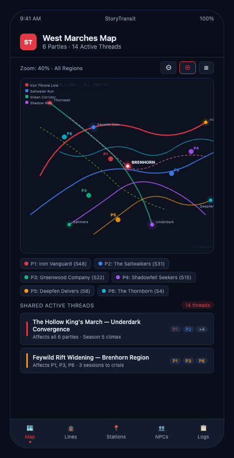 StoryTransit's West Marches mode treats each rotating player group as a separate transit line operating on the same network, automatically updating world state records after each session and surfacing threads that haven't been touched in too long.
