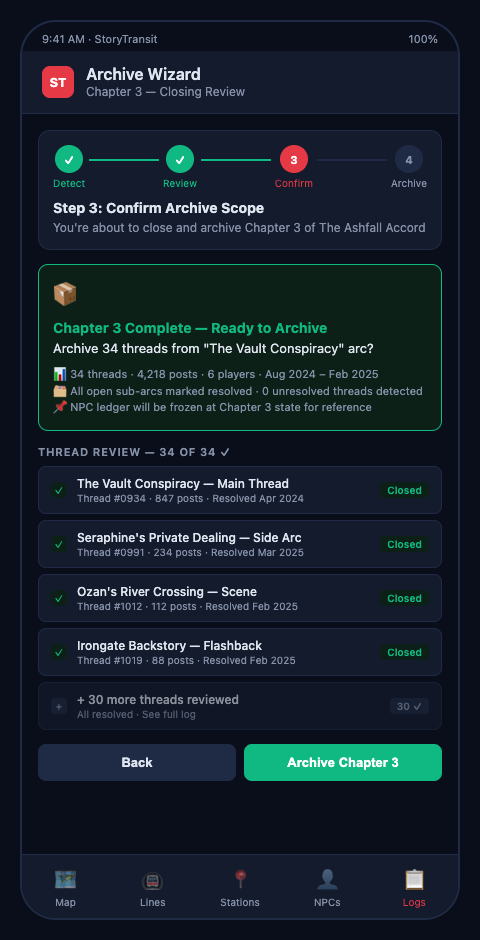 StoryTransit addresses the archive layer problem by embedding the documentation framework into the campaign's transit map structure. When a chapter closes, every resolved line in the map gets tagged with its resolution state and the chapter it was resolved in. Dormant stops that are being carried forward are flagged explicitly, not left as orphaned entries in an archive subforum.