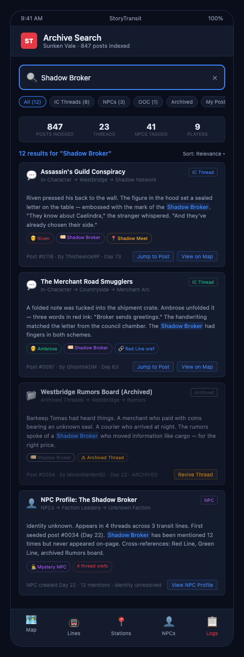 The station log answers the question "what happened in this thread?" StoryTransit's station log structure is the operational core of the searchable story history: for each active transit line in your campaign — each plot thread — the station log records every meaningful story beat with its thread reference, page number, post number, and date. When you need to know what the herbalist said to Kael three months ago, the station log gives you "Red Line / Station 4 / Merchant Quarter Thread #2 / Page 3 / Post 67 / 2026-01-12." You go directly to that post.