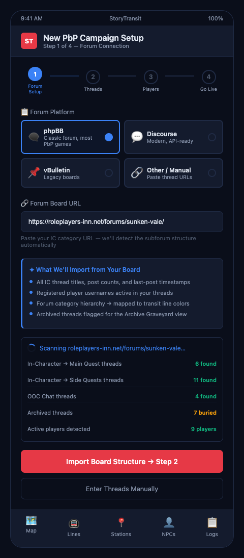 What no platform automates is the story map layer — the transit line tracking, dormant stop registry, and thread index. That documentation lives outside the platform itself, regardless of which forum you use. The platform hosts the IC and OOC threads. You maintain the map.