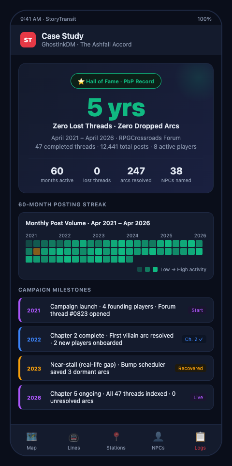 StoryTransit builds this transit map discipline into the tool itself—every thread you open becomes a line, every post a station, and every dormancy threshold triggers an automatic flag in your dashboard. If you're running a long-running forum game and want to reach Year Five with every arc accounted for, the waitlist is the place to start. Play-by-post forum GMs get early access and direct input on the feature roadmap—join the waitlist and tell us which part of your archive is hardest to navigate.