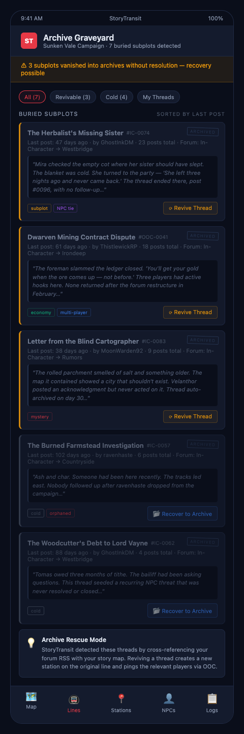 StoryTransit builds this logic directly into the GM workflow. Every subplot you introduce gets logged as a transit line. When a thread goes inactive — whether by player absence, pacing decisions, or deliberate narrative delay — it becomes a dormant stop on the map rather than disappearing from view. The GM can see at a glance which lines are active, which are dormant, and which are approaching the point where revival requires excavation rather than a simple bump.