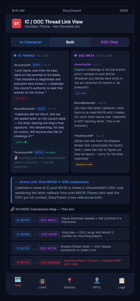 Station tagging across thread types. Every major story beat — a duel, a revelation, a faction meeting — gets tagged as a station on both the IC route and the OOC maintenance log. Your IC post records the narrative event. Your OOC thread records the mechanical decisions that produced it. StoryTransit links these as parallel records of the same station, so you can read either layer without contaminating the other.
