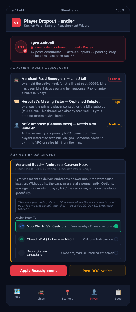 The dormant stop archive is what makes the difference between a handled departure and a lost arc. A character who left mid-campaign with three active subplot commitments and two pending NPC relationships represents real story infrastructure. With a complete dormant stop record — last IC post, unresolved hooks, mechanical history — another player can step into that slot with full context, or the GM can close the arc organically through NPC-driven consequences that don't require the absent character to post. Without that record, the arc simply disappears, and other players feel its absence as a gap in the world's coherence.