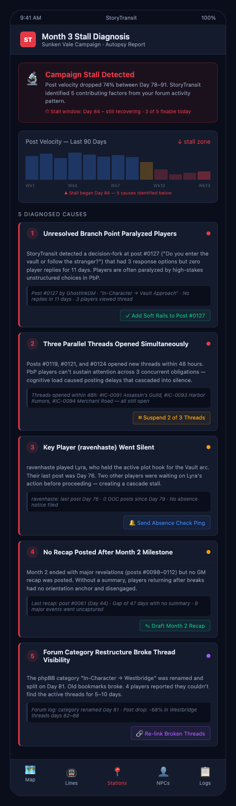 The structural fix is to design threads so that no single player's absence blocks more than one storyline. Keep your transit lines parallel rather than sequential: if the Red Line stalls because a player went silent, the Blue Line and Green Line should still be running. The GM's job at month three is to ensure there are always at least two active threads so that a ghost doesn't take the whole campaign with them.