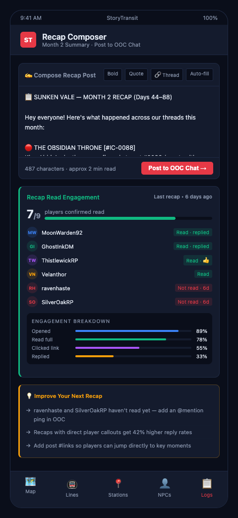 StoryTransit generates transit-style recap templates for play-by-post forum GMs, pulling the current status of each active line and dormant stop directly from your campaign map. Join the Waitlist for Play-by-Post GMs to access structured recap generation that cuts your prep time and produces recaps players actually read.