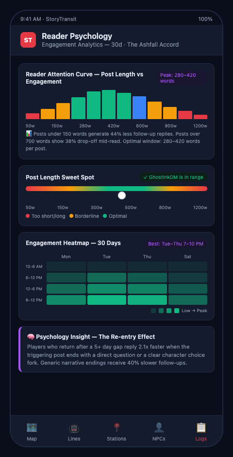 Progress markers. The absence of visible progress is a primary driver of PbP dropout. Players who have been posting to a slow-burn arc for four months with no apparent forward movement lose confidence that the arc is going anywhere. StoryTransit's station structure makes progress visible at the line level: players can see that their arc has moved from Station 3 to Station 5 even if individual posts felt incremental.