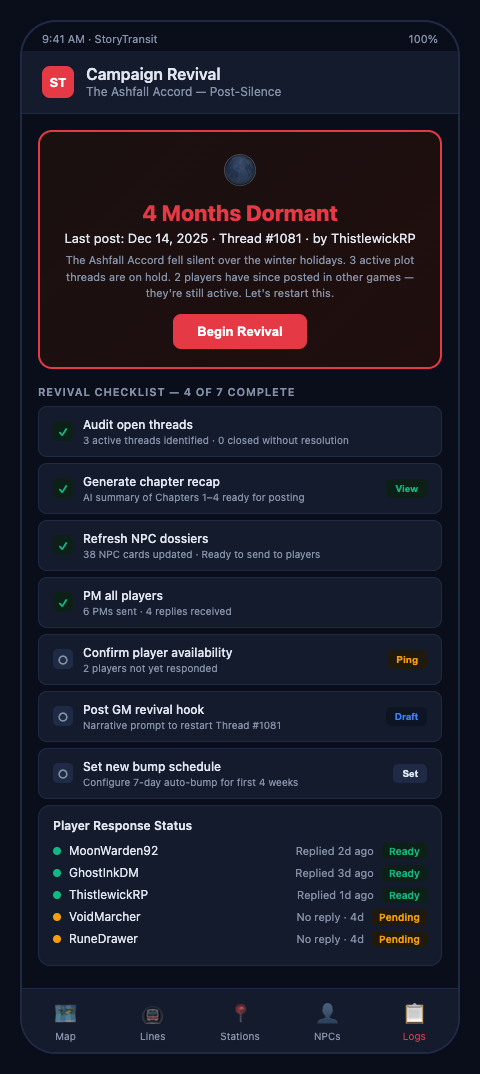 Play-by-post forum GMs who've been sitting on a dormant campaign don't need a new reason to revive—they need a system that makes revival structurally sound. StoryTransit gives you the transit map to assess which lines are worth restarting, the dormancy tracking to sequence reactivation intelligently, and the player-facing views to help returning players find their footing. Join the waitlist and let's bring your dormant campaign back to life.