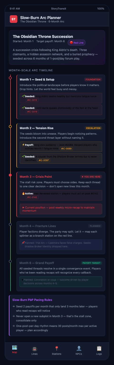 StoryTransit is built for play-by-post forum GMs running slow-burn arcs across months of thread pagination. The transit line view shows you every arc's current phase, next scheduled station, and days since last activity — at a glance, before every IC post. Join the Waitlist for Play-by-Post GMs and get early access to the arc management tools designed for the forum GM's one-post-per-day session cadence.