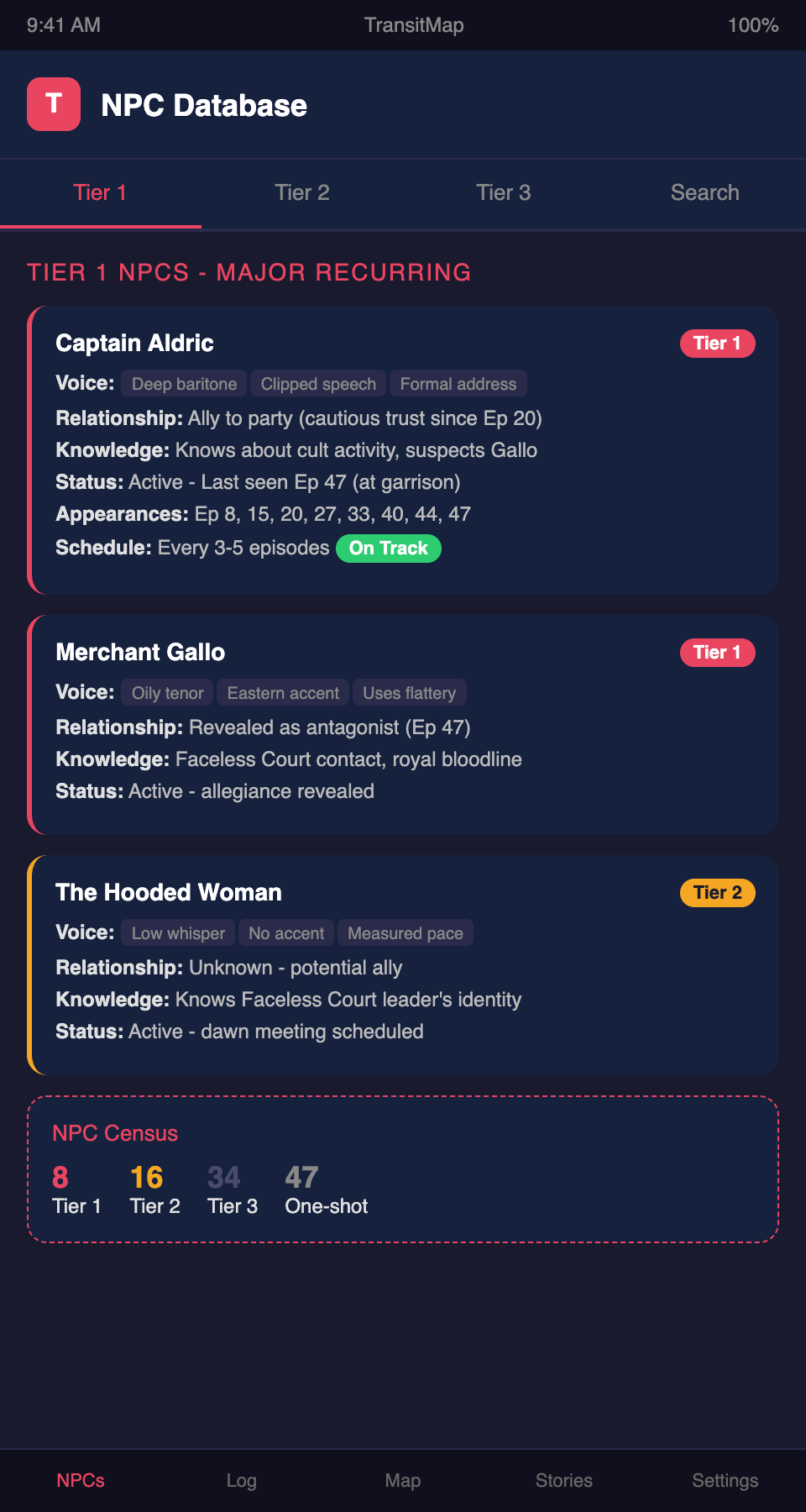 Tracking dozens of NPCs across your actual play show? Join the TransitMap waitlist — map every NPC as a stop on your narrative transit map, with voice notes, relationship connections, appearance history, and knowledge states all tracked visually.